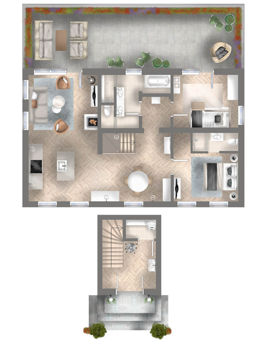 Das große Schlafzimmer ist mit einem hochwertigen Boxspringbett ausgestattet. Im zweiten Schlafzimmer befindet sich ein Etagenbett mit zwei Schlafplätzen (für die Kinder). Alle Schlafmöglichkeiten sind mit einer zusätzlichen Toppermatratze für den optimalen Schlaf ausgestattet. Das Apartment verfügt über zwei Flachbildfernseher (Wohnzimmer und Masterbedroom). Im Wohnzimmer befindet sich darüber hinaus ein wunderschöner Kamin der für eine gemütliche Atmosphäre sorgt. Über das Wohnzimmer, Wellness-Bad und das 2. Schlafzimmer gelangen sie direkt auf die ca. 50m² große Terrasse. Ein Parkplatz steht Ihnen kostenlos direkt auf dem Hof des Grundstücks zur Verfügung.